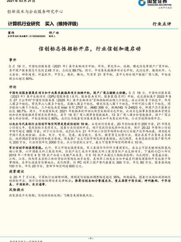 【国金证券】【20210321】计算机行业研究:信创标志性招标开启,行业信创加速启动-3页 行业研究