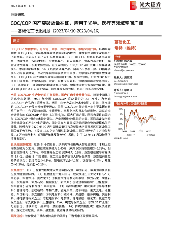 【光大证券】【20230416】基础化工行业周报:COC COP国产突破放量在即,应用于光学、医疗等领域空间广阔-27页 行业研究