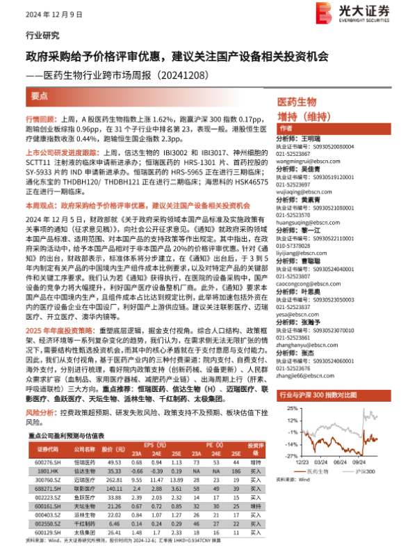 【光大证券】【20241209】医药生物行业跨市场周报:政府采购给予价格评审优惠,建议关注国产设备相关投资机会-16页 行业研究