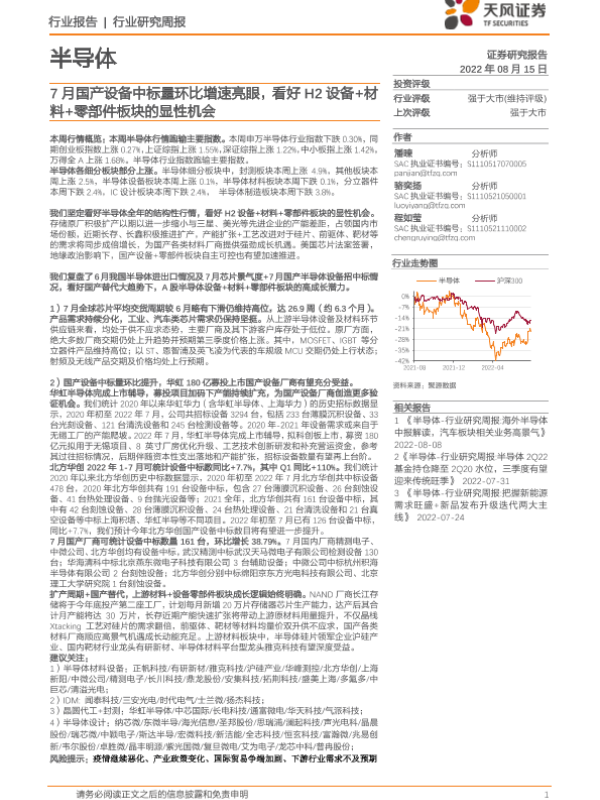 【天风证券】【20220815】20220815-天风证券-半导体行业研究周报:7月国产设备中标量环比增速亮眼,看好H2设备+材料+零部件板块的显性机会-21页 行业研究
