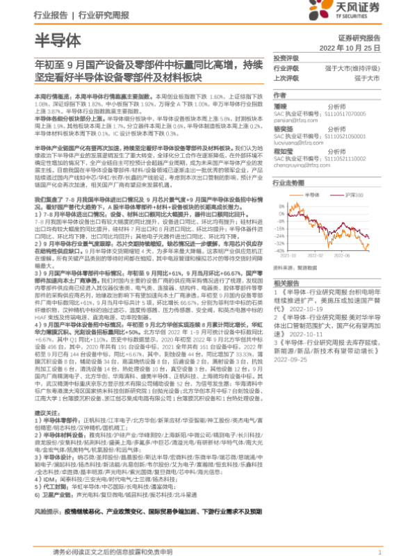 【天风证券】【20221025】20221025-天风证券-半导体行业研究周报:年初至9月国产设备及零部件中标量同比高增,持续坚定看好半导体设备零部件及材料板块-21页 行业研究