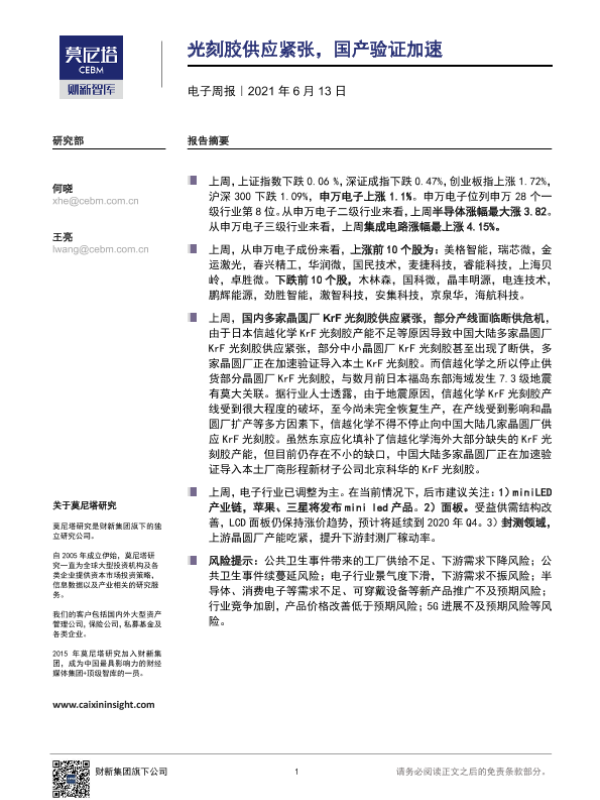 【莫尼塔研究】【20210613】20210613-莫尼塔投资-电子周报:光刻胶供应紧张,国产验证加速-8页 行业研究