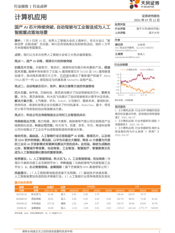 【天风证券】【20210711】计算机应用:国产AI芯片持续突破,自动驾驶与工业智造成为人工智能重点落地场景-4页 行业研究