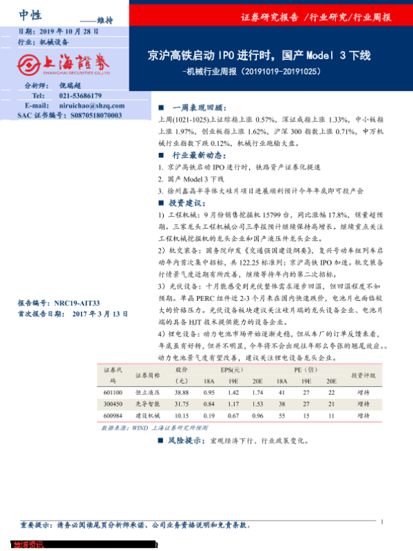【上海证券】【20191028】机械行业周报:京沪高铁启动IPO进行时,国产Model 3下线-5页 行业研究
