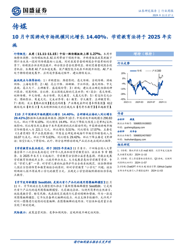 【国盛证券】【20241117】20241117-国盛证券-传媒行业周报:10月中国游戏市场规模同比增长14.40%,学前教育法将于2025年实施-10页 行业研究
