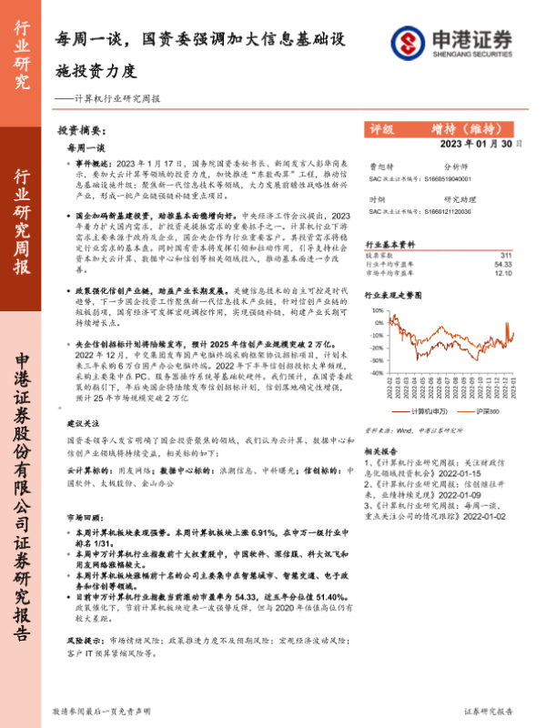 【申港证券】【20230130】20230130-申港证券-计算机行业研究周报:每周一谈,国资委强调加大信息基础设施投资力度-10页 行业研究