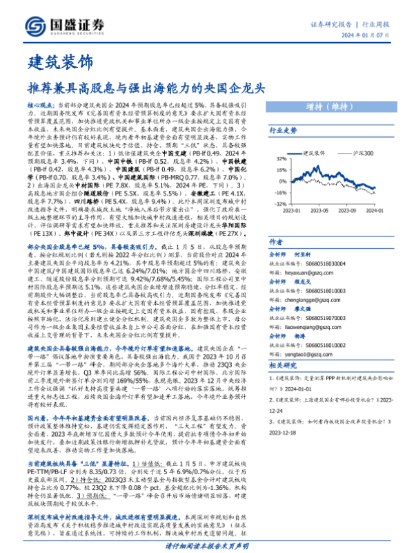 【国盛证券】【20240107】建筑装饰行业周报:推荐兼具高股息与强出海能力的央国企龙头-10页 行业研究