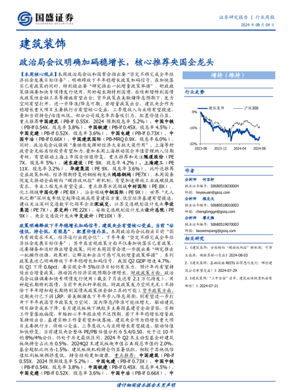 【国盛证券】【20240804】建筑装饰行业周报:政治局会议明确加码稳增长,核心推荐央国企龙头-14页 行业研究