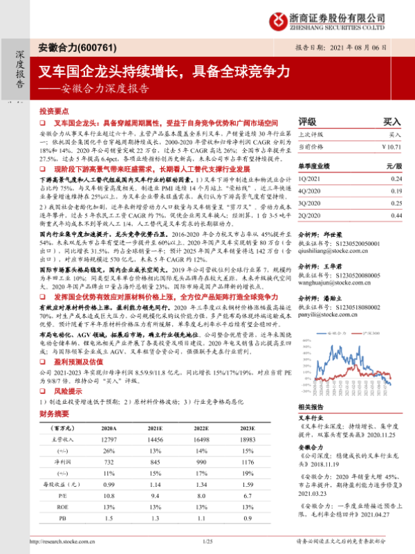 【浙商证券】【20210806】安徽合力深度报告:叉车国企龙头持续增长,具备全球竞争力-25页 行业研究