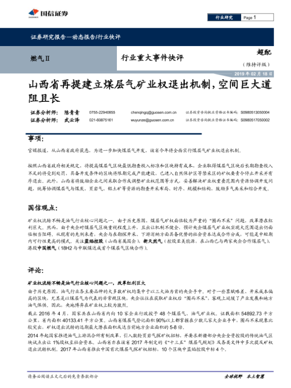 【国信证券】【20190218】燃气行业重大事件快评:山西省再提建立煤层气矿业权退出机制,空间巨大道阻且长-5页 行业研究