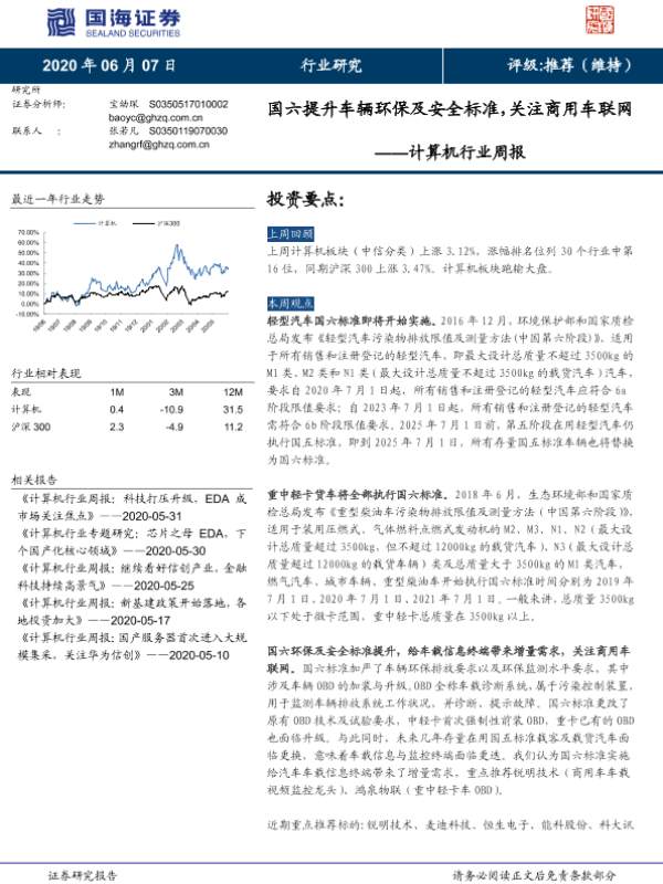 【国海证券】【20200607】计算机行业周报:国六提升车辆环保及安全标准,关注商用车联网-15页 行业研究