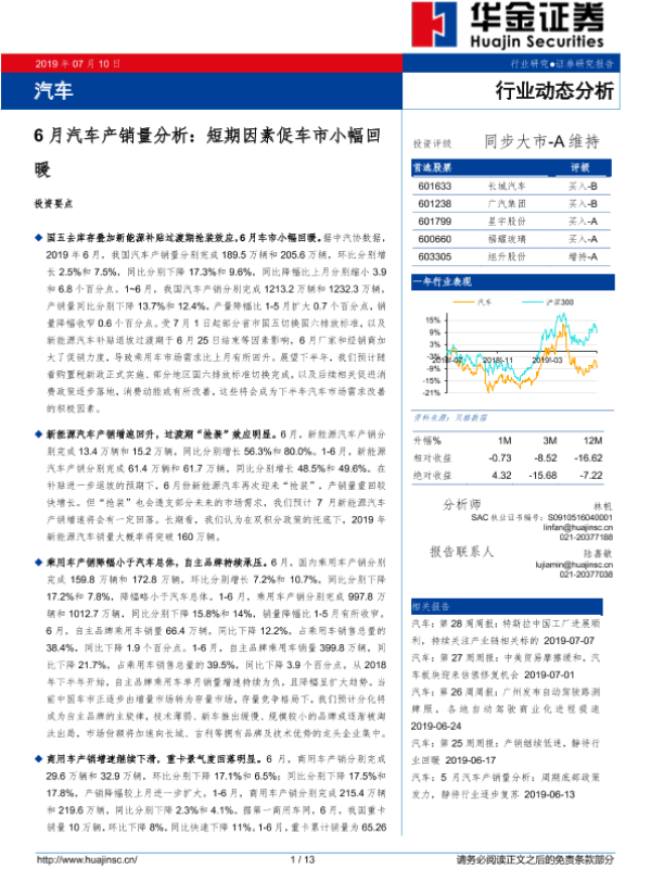 【华金证券】【20190710】6月汽车产销量分析:短期因素促车市小幅回暖-13页 行业研究