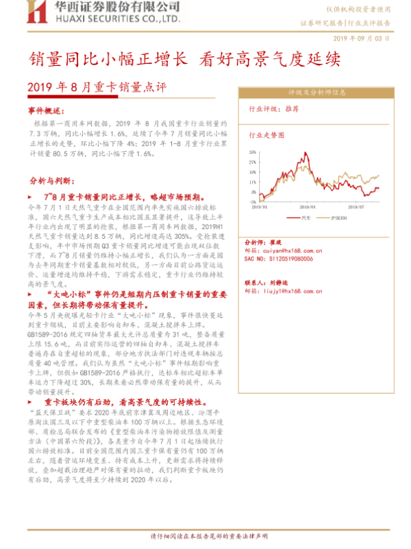 【华西证券】【20190903】2019年8月重卡销量点评:销量同比小幅正增长 看好高景气度延续-4页 行业研究