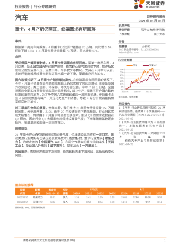 【天风证券】【20210505】重卡:4月产销仍两旺,终端需求有所回落-11页 行业研究