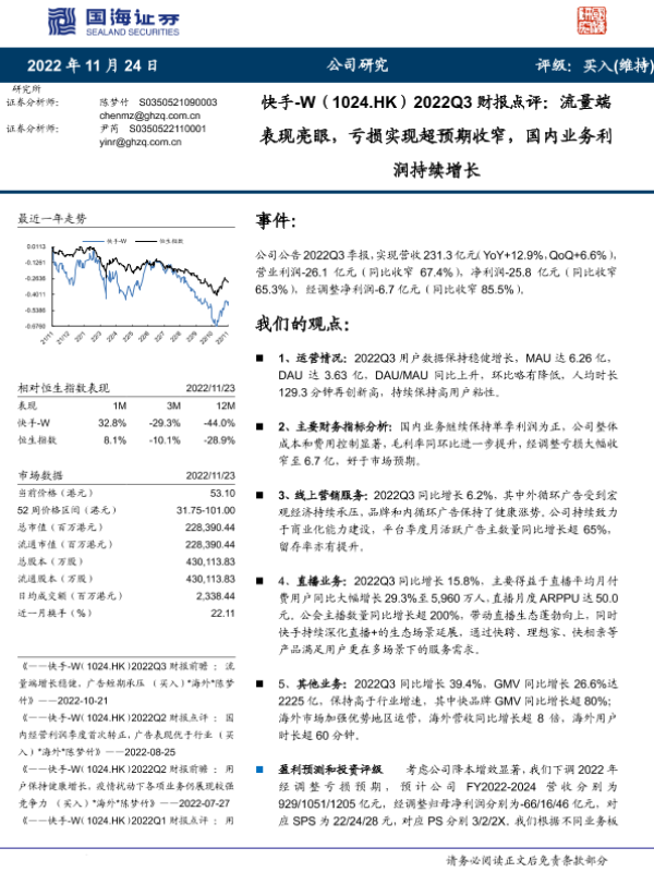 【国海证券】【20221124】快手-W2022Q3财报点评:流量端表现亮眼,亏损实现超预期收窄,国内业务利润持续增长-14页 行业研究