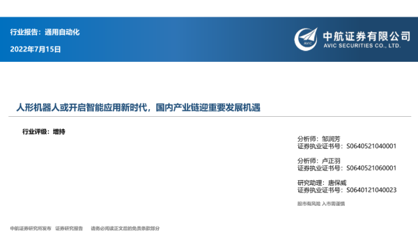 【中航证券】【20220715】通用自动化行业:人形机器人或开启智能应用新时代,国内产业链迎重要发展机遇-39页 行业研究