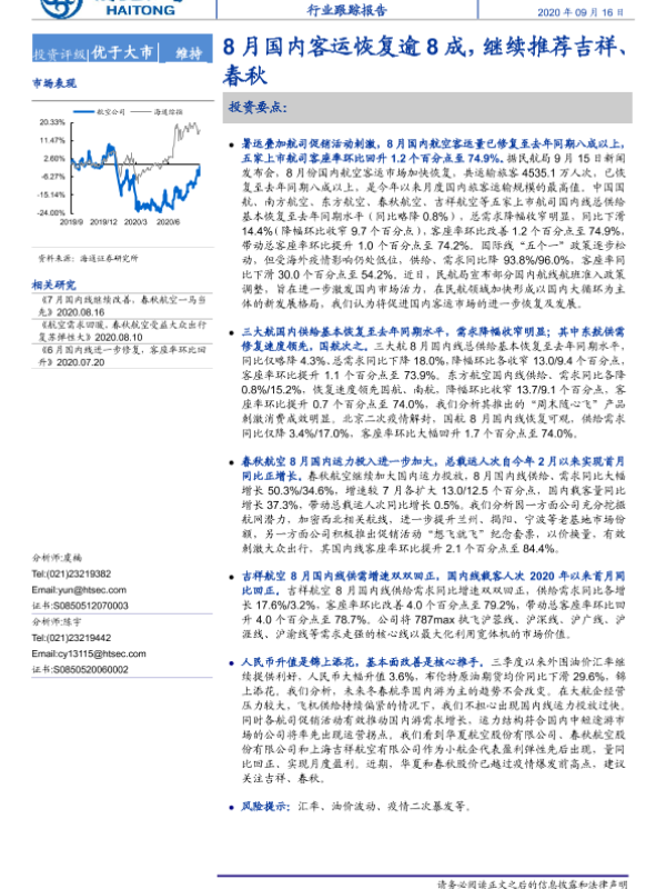 【海通证券】【20200916】8月国内客运恢复逾8成,继续推荐吉祥、春秋-4页 行业研究