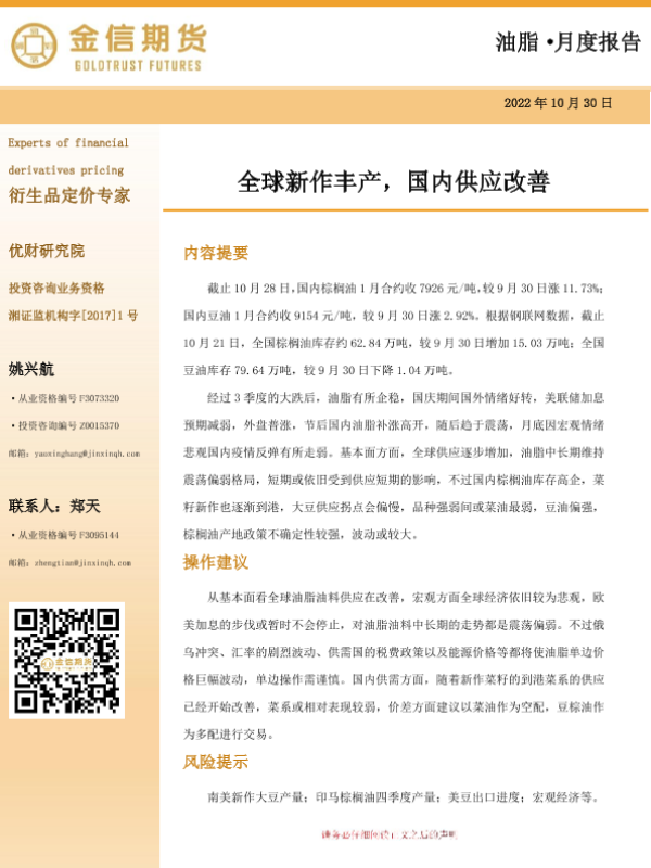 【金信期货】【20221030】油脂·月度报告:全球新作丰产,国内供应改善-17页 行业研究