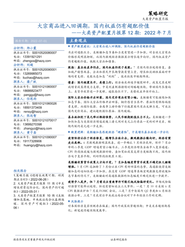 【华安证券】【20220701】大类资产配置月报第12期:2022年7月,大宗商品进入回调期,国内权益仍有超配价值-24页 行业研究