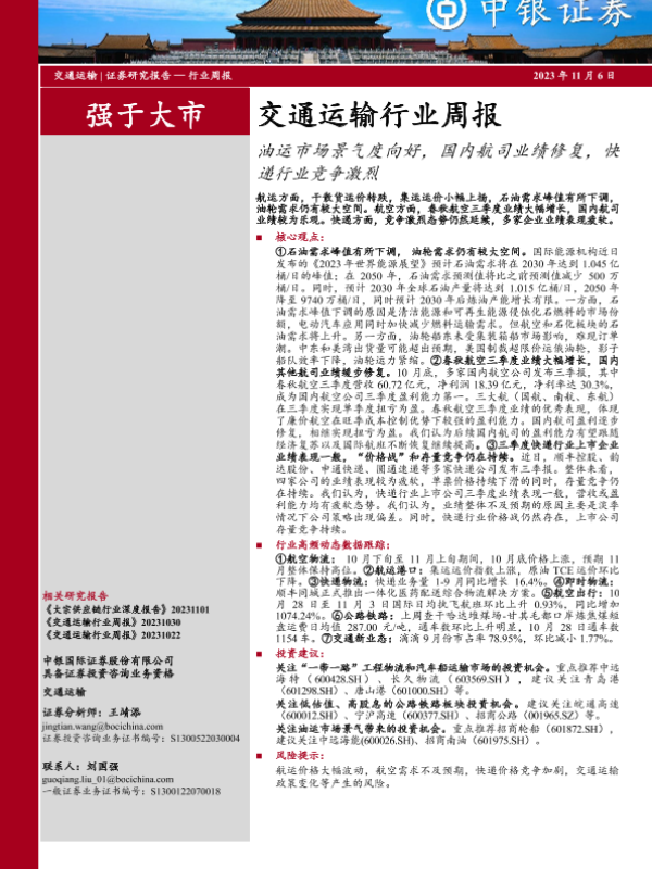 【中银证券】【20231106】交通运输行业周报:油运市场景气度向好,国内航司业绩修复,快递行业竞争激烈-30页 行业研究