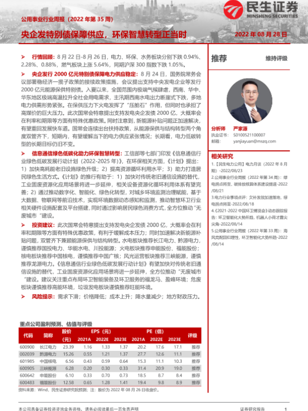 【民生证券】【20220828】公用事业行业周报:央企发特别债保障供应,环保智慧转型正当时-29页 行业研究