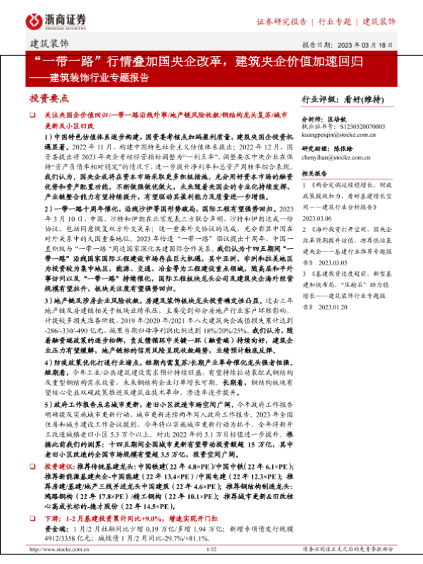【浙商证券】【20230318】建筑装饰行业专题报告:“一带一路”行情叠加国央企改革,建筑央企价值加速回归-32页 行业研究
