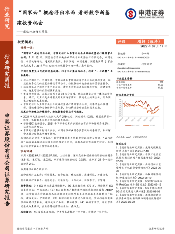【申港证券】【20220717】20220717-申港证券-通信行业研究周报:“国家云”概念浮出水面 看好数字新基建投资机会-9页 行业研究