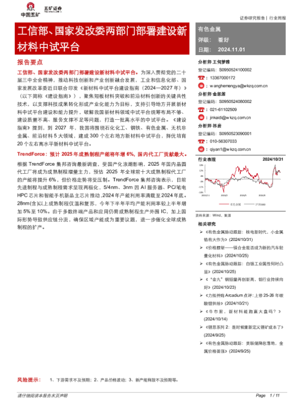 【五矿证券】【20241101】20241101-五矿证券-有色金属行业周报:工信部、国家发改委两部门部署建设新材料中试平台-11页 行业研究