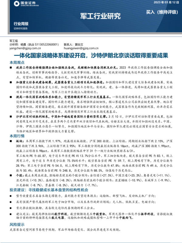 【国金证券】【20230312】20230312-国金证券-军工行业研究:一体化国家战略体系建设开启,沙特伊朗北京谈话取得重要成果-13页 行业研究