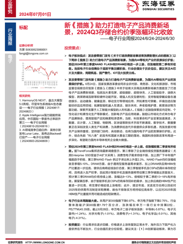 【东海证券】【20240701】新《措施》助力打造电子产品消费新场景,2024Q3存储合约价季涨幅环比收敛-14页 行业研究