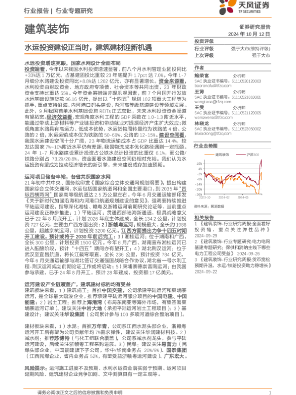 【天风证券】【20241012】建筑装饰行业专题研究:水运投资建设正当时,建筑建材迎新机遇-25页 行业研究