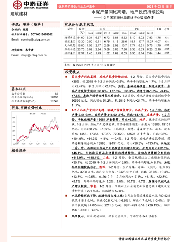 【中泰证券】【20210316】建筑建材-1-2月国家统计局建材行业数据点评:水泥产量同比高增,地产投资持续拉动-8页 行业研究