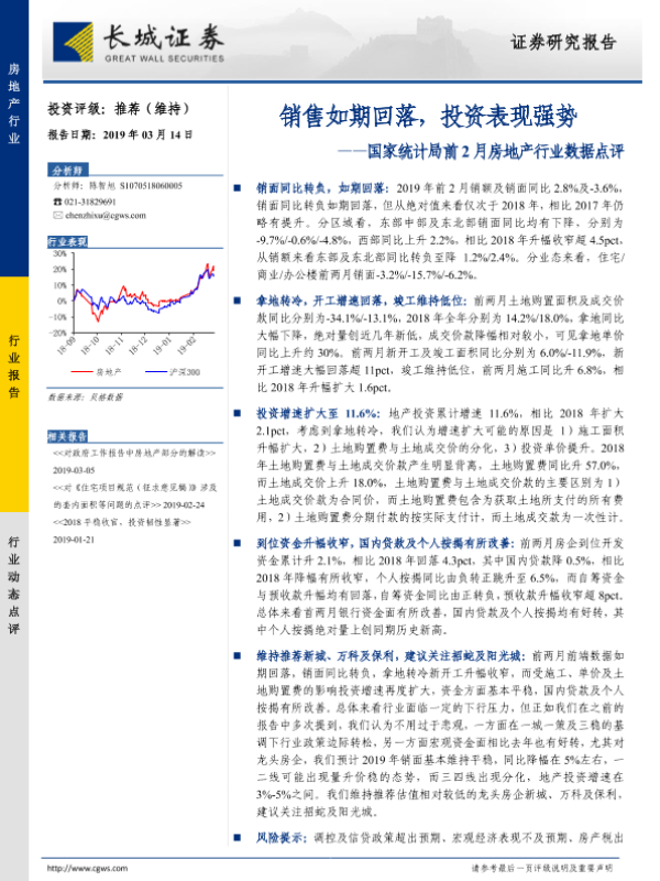【长城证券】【20190314】国家统计局前2月房地产行业数据点评:销售如期回落,投资表现强势-9页 行业研究