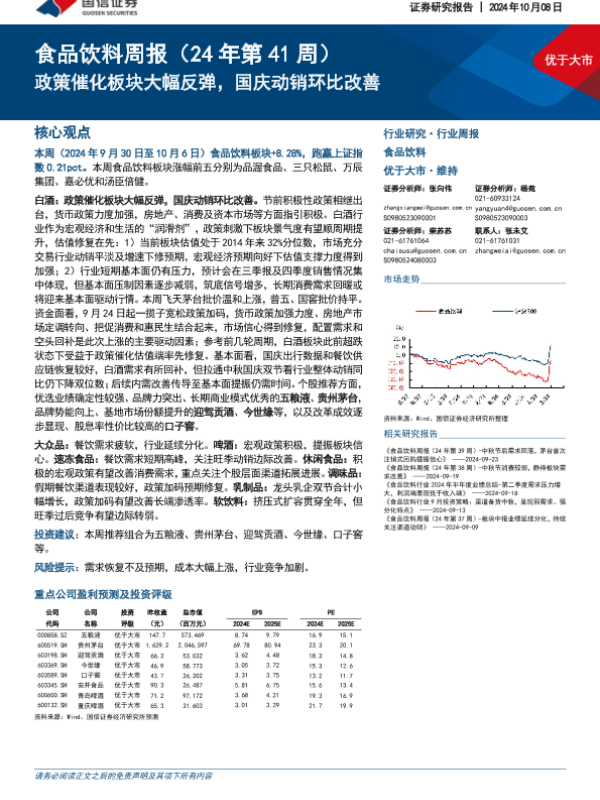 【国信证券】【20241008】20241008-国信证券-食品饮料周报(24年第41周):政策催化板块大幅反弹,国庆动销环比改善-14页 行业研究