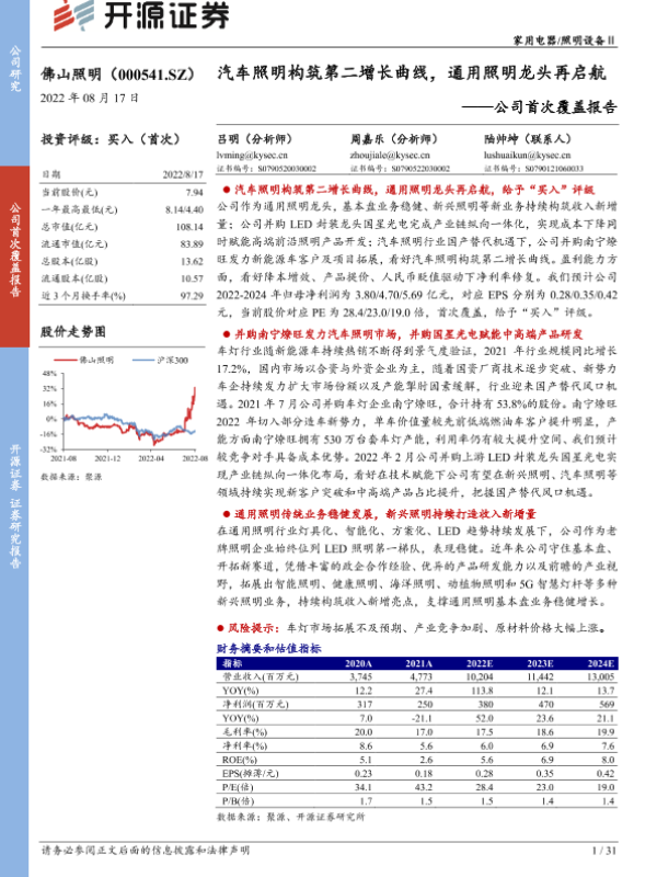 【开源证券】【20220817】公司首次覆盖报告:汽车照明构筑第二增长曲线,通用照明龙头再启航-31页 证券期货研究报告