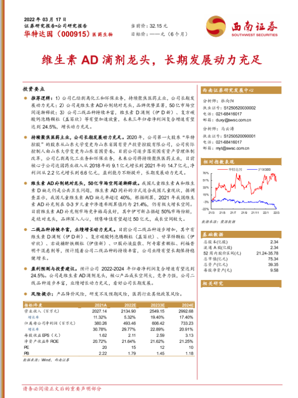【西南证券】【20220317】华特达因-维生素AD滴剂龙头,长期发展动力充足-21页 行业研究
