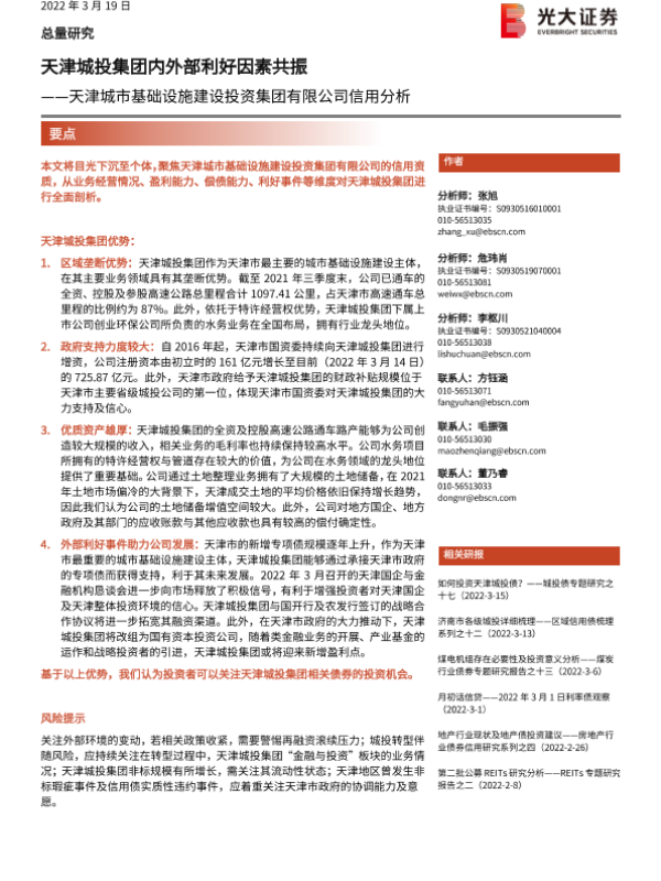 【光大证券】【20220319】天津城市基础设施建设投资集团有限公司信用分析:天津城投集团内外部利好因素共振-31页 行业研究