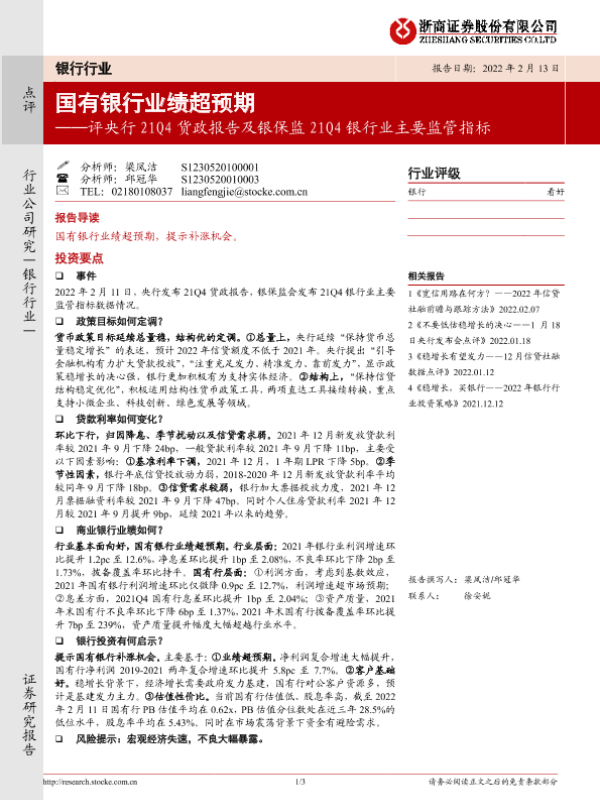 【浙商证券】【20220213】国有银行业绩超预期-3页 行业研究