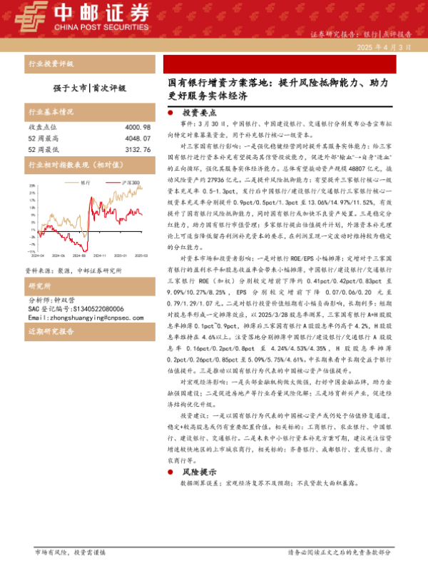 【中邮证券】【20250403】国有银行增资方案落地:提升风险抵御能力、助力更好服务实体经济-10页 行业研究