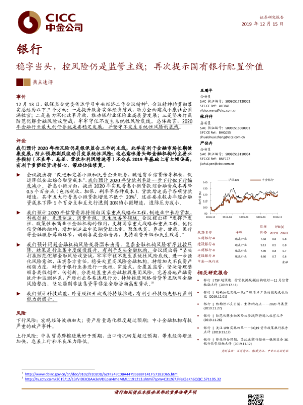【中金公司】【20191215】银行热点速评:稳字当头,控风险仍是监管主线;再次提示国有银行配置价值-5页 行业研究