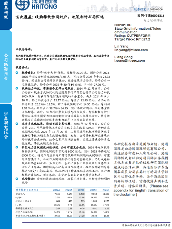 【海通国际】【20250425】国网信通(600131)首次覆盖:收购释放协同效应,政策利好布局深远-23页 证券期货研究报告