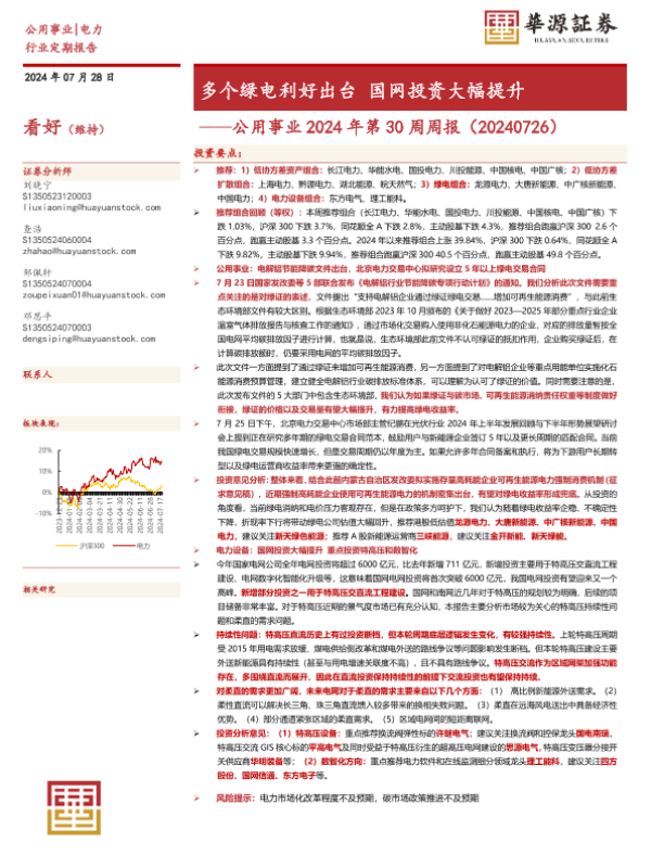 【华源证券】【20240728】公用事业2024年第30周周报:多个绿电利好出台 国网投资大幅提升-12页 行业研究
