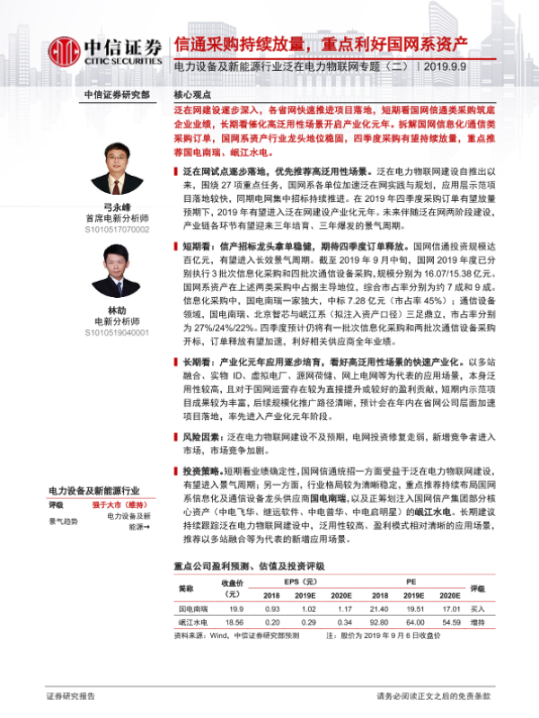 【中信证券】【20190909】电力设备及新能源行业泛在电力物联网专题(二):信通采购持续放量,重点利好国网系资产-17页 行业研究