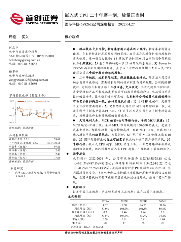 【首创证券】【20220427】20220427-首创证券-国芯科技-688262.SH-公司深度报告:嵌入式CPU二十年磨一剑,放量正当时-31页 行业研究