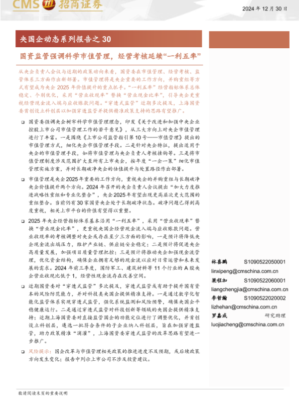 【海通证券】【20241230】央国企动态系列报告之30:国资监管强调科学市值管理,经营考核延续“一利五率”-32页 行业研究