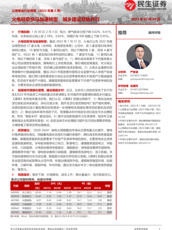 【民生证券】【20230204】公用事业行业周报:火电轻歌快马加速转型,城乡建设双轨并行-28页 行业研究