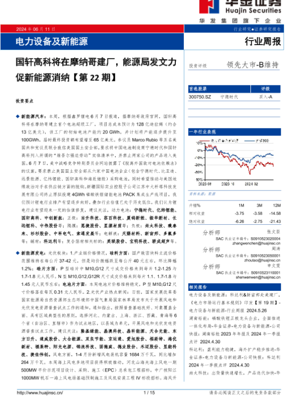 【华金证券】【20240611】电力设备及新能源行业周报:国轩高科将在摩纳哥建厂,能源局发文力促新能源消纳【第22期】-15页 行业研究