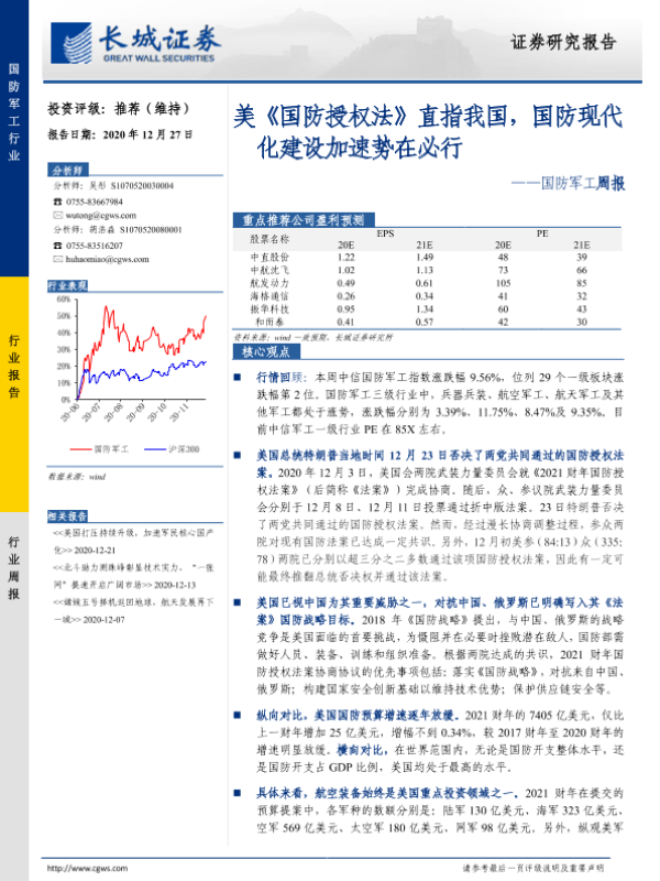 【长城证券】【20201227】20201227-长城证券-国防军工周报:美《国防授权法》直指我国,国防现代化建设加速势在必行-23页 行业研究