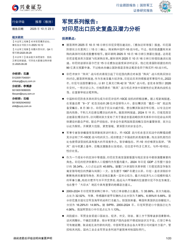 【兴业证券】【202510】军贸系列报告:对印尼出口历史复盘及潜力分析-20页 证券期货研究报告
