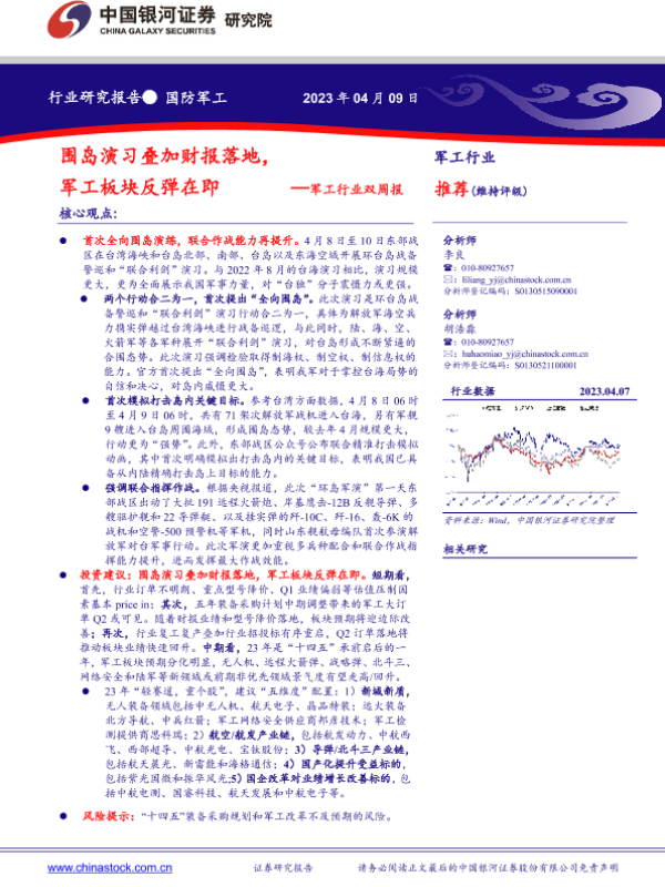 【银河证券】【20230409】20230409-中国银河-军工行业双周报:围岛演习叠加财报落地,军工板块反弹在即-12页 行业研究